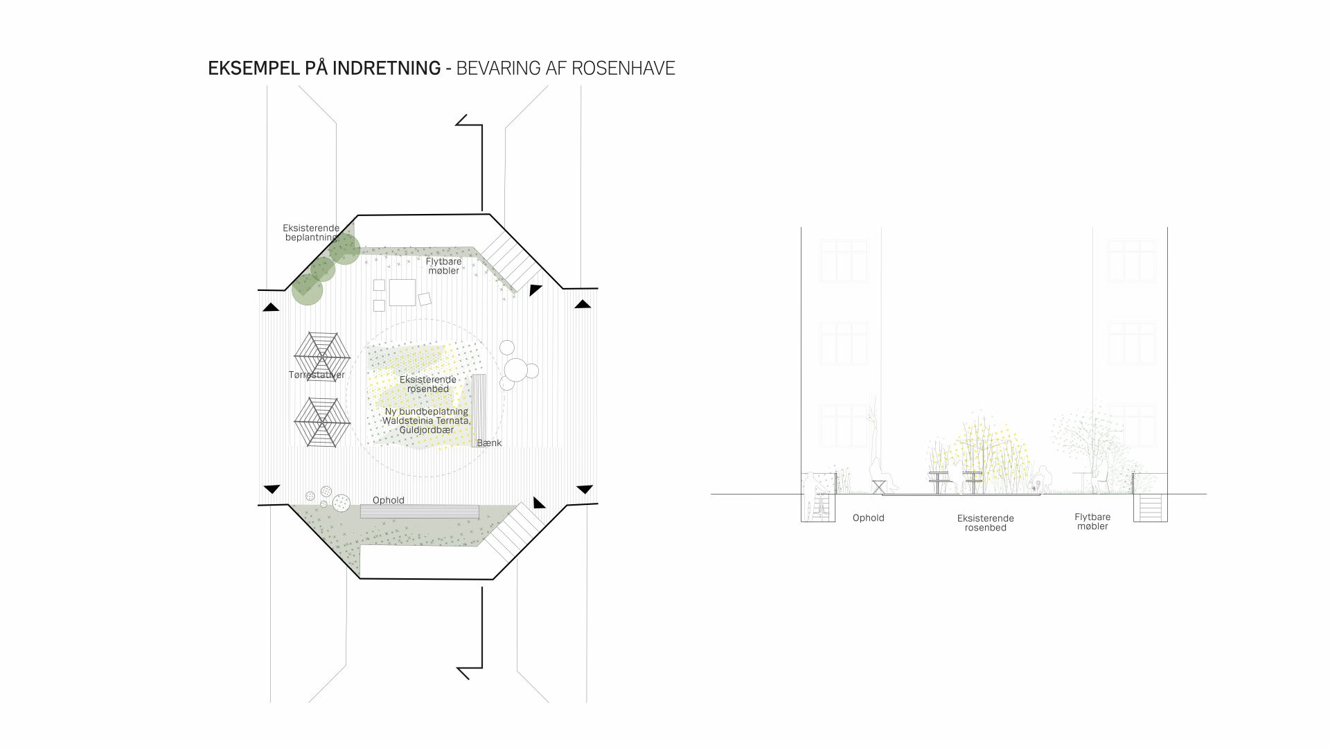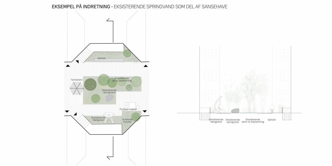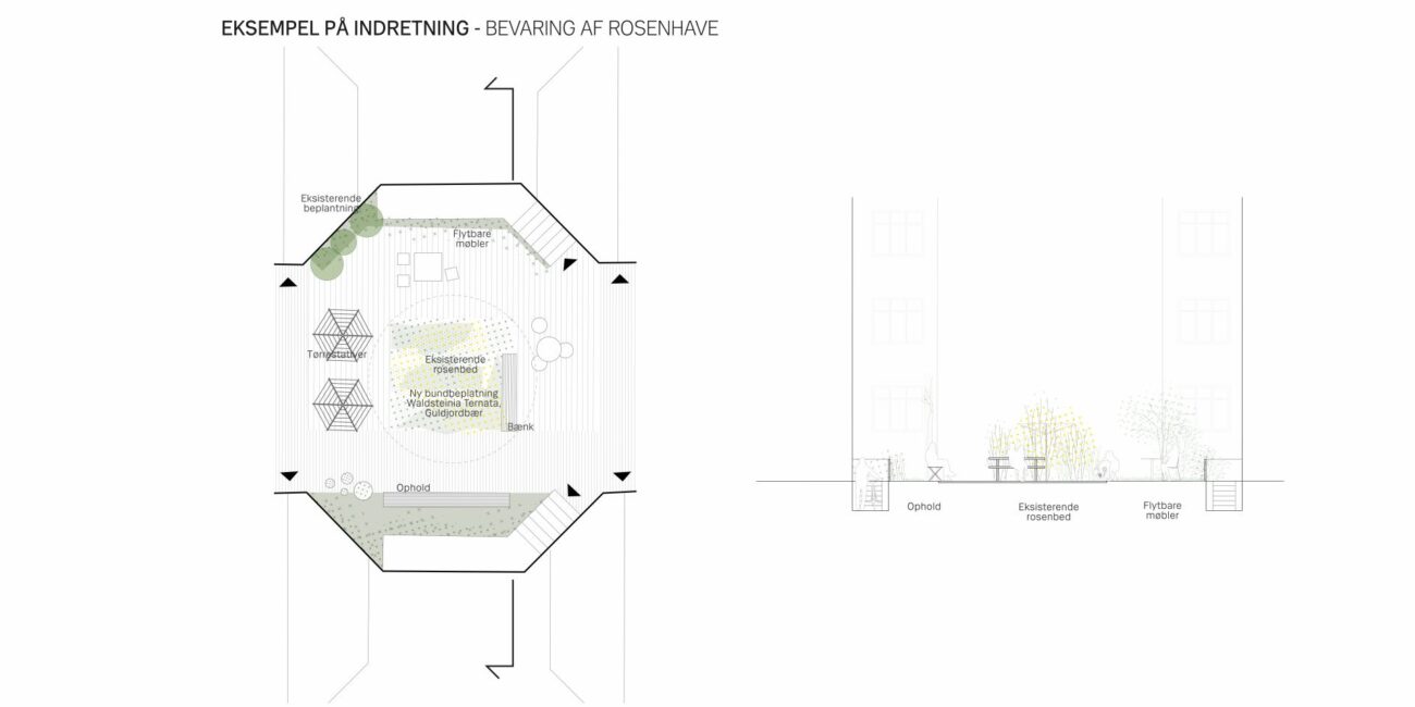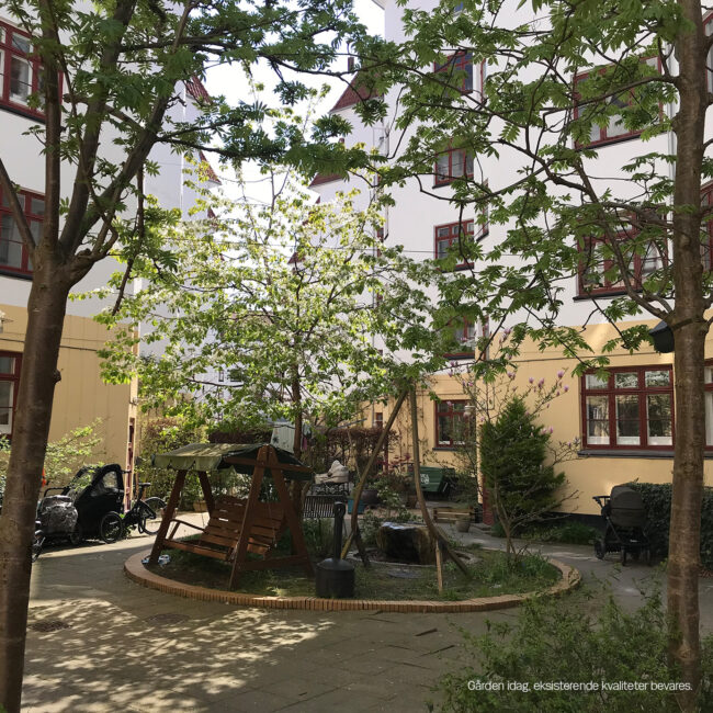 En omdisponering af gårdrummet skal forbedre flowet og skabe en mere sammenhængende gård. Forslaget giver således mulighed for en optimal placering af ophold og leg, og der skabes brugbare opholdsnicher langs bebyggelsen til mindre grupper samt større opholdsarealer hvor mange kan samles. Eksisterende beplantning der trives i gården bevares og der introduceres yderligere en større variation i beplantningen som led i en i højere grad, begrønnet gård.