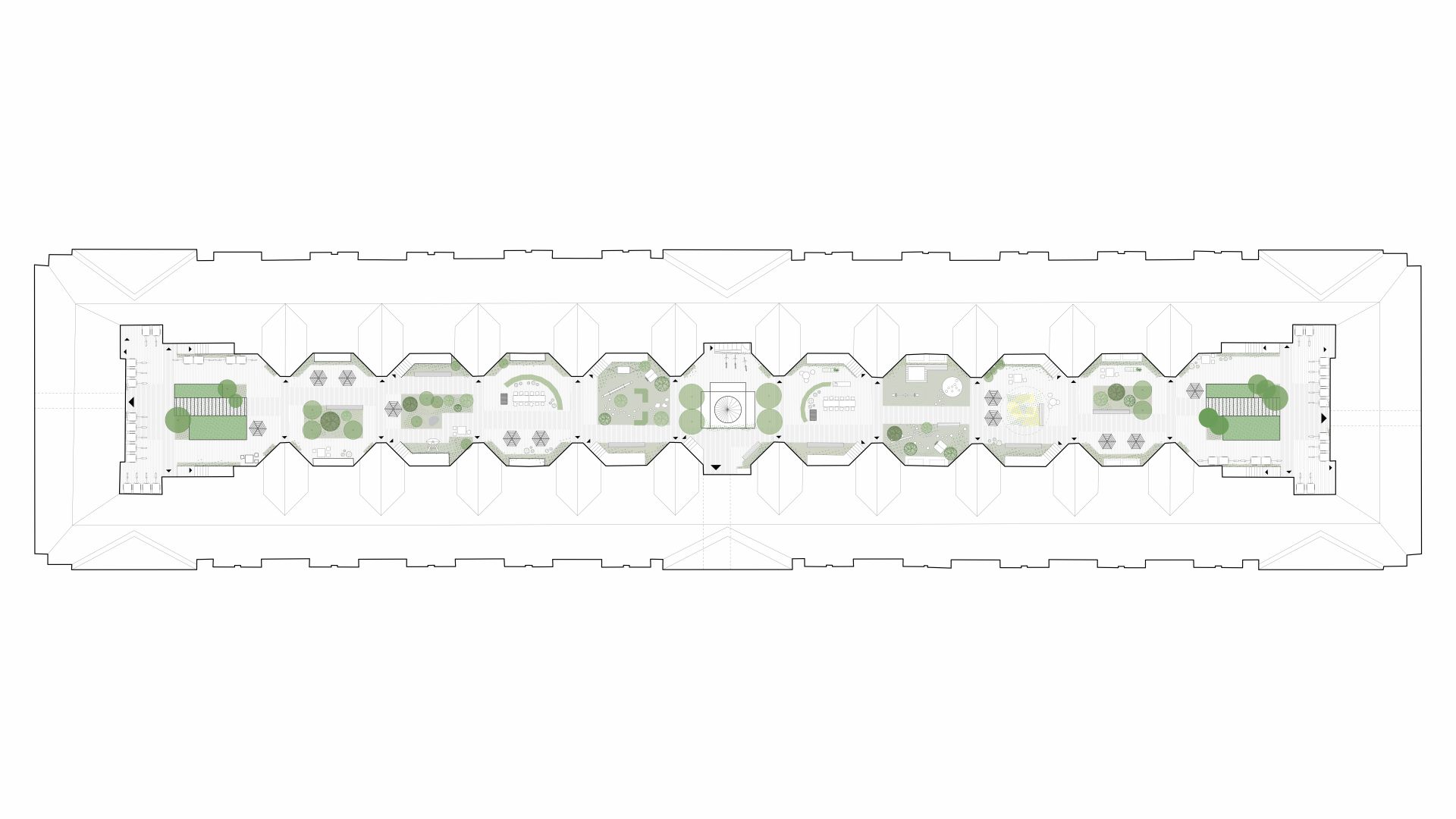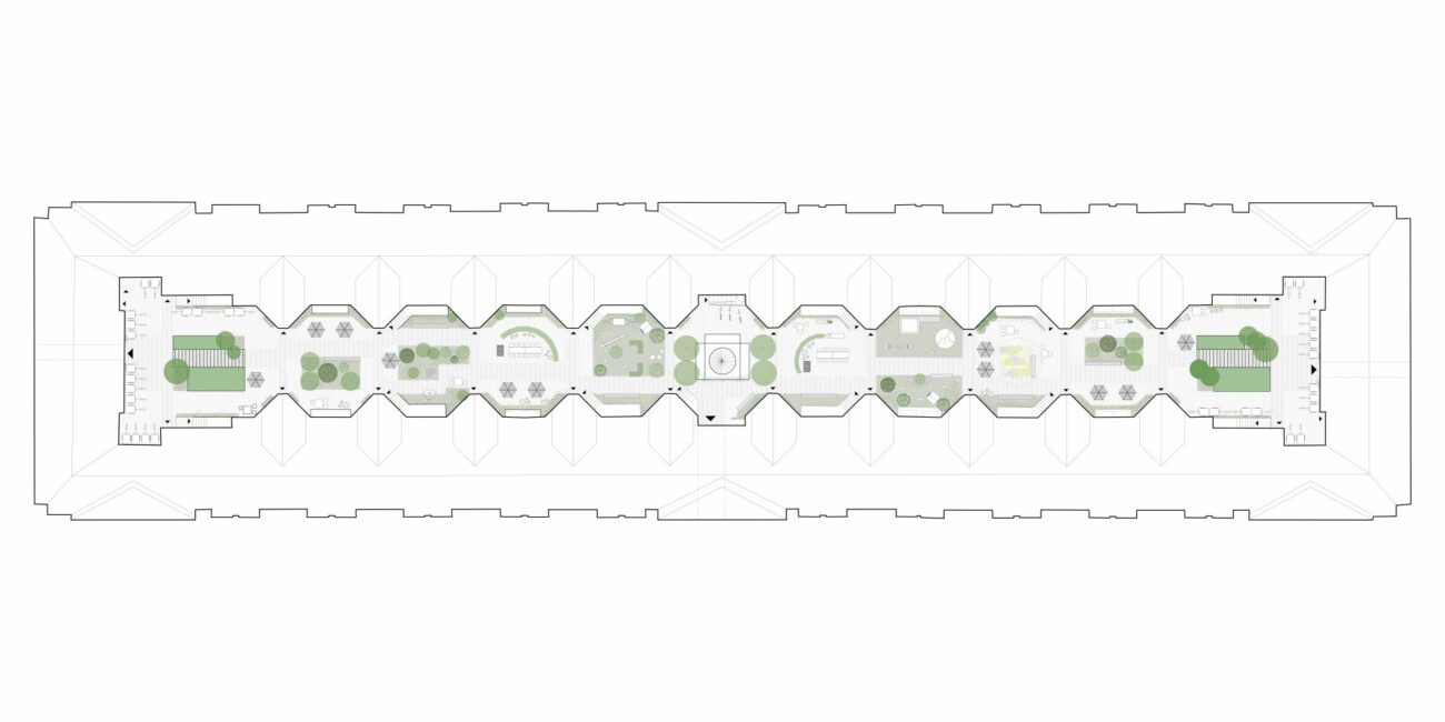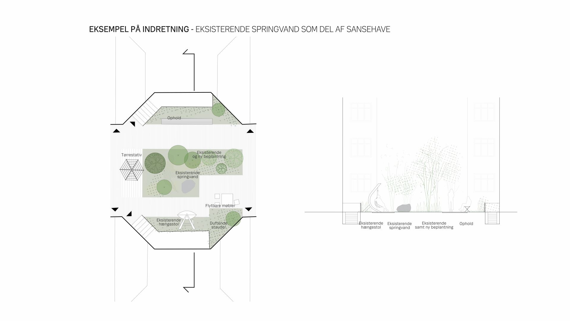 En omdisponering af gårdrummet skal forbedre flowet og skabe en mere sammenhængende gård. Forslaget giver således mulighed for en optimal placering af ophold og leg, og der skabes brugbare opholdsnicher langs bebyggelsen til mindre grupper samt større opholdsarealer hvor mange kan samles. Eksisterende beplantning der trives i gården bevares og der introduceres yderligere en større variation i beplantningen som led i en i højere grad, begrønnet gård.