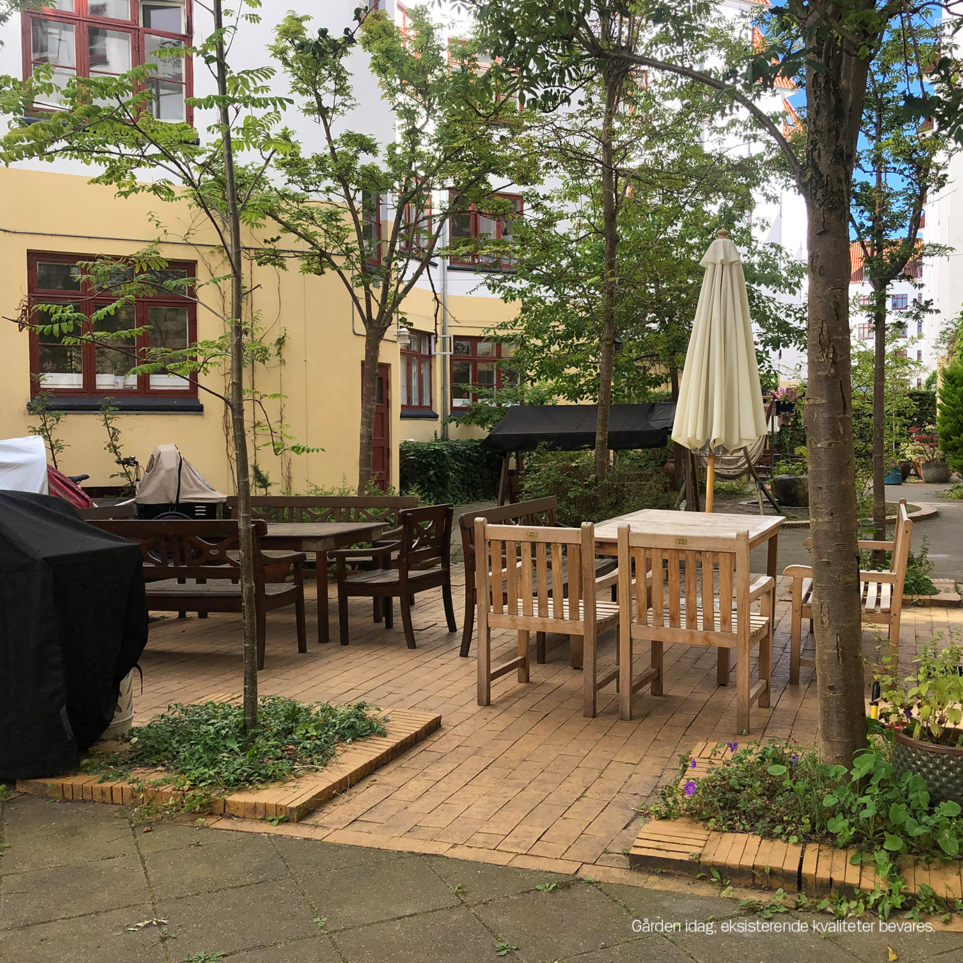 Fotos viser gården som den ser ud idag, hvor eksisterende kvaliteter bevares.