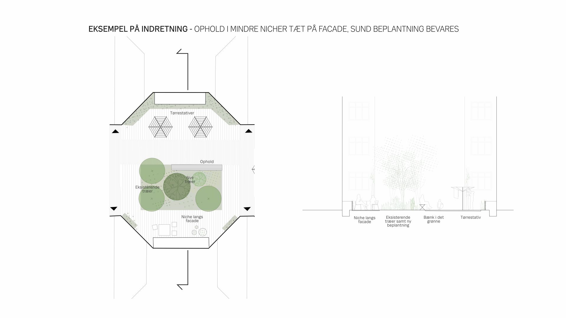 Skitseforslaget udgøres af situationsplan og eksempler på indretning af gårdens forskellige rum, der ligger som perler på en snor, hvor forskellige aktiviteter indtænkes. Praktiske funktioner såsom affaldshåndtering og ladcykelparkering i gården udformes med lette konstruktioner og grønne tage og det undersøges hvordan der kan skabes en lettere adgang for cykelparkering i kælderen.