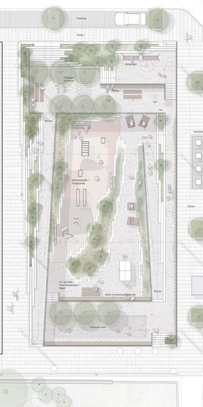 Aktivitetspladsen er placeret i bunden af bydelen, hvorfor pladsen indgår som en naturlig del af den omfattende skybrudsplan. Pladsen underinddeles i felter i forskellige niveauer for at give mulighed for at tilbageholde vand samt for at skabe plads til forskellige aktiviteter samtidigt. De nedsænkede niveauer omgrænses af en støttemur, for at skabe et visuelt sammenhængende udtryk. Der er benyttet forskellige materialer og/eller underlag, som eks. faldgummi, der er tilpasset de tiltænkte aktiviteter. Pladsens beplantning og belysning skal understrege felternes forskelligheder lokalt, men tilsammen skal de fremstå som en helhed. Beplantningen er karakterfulde blomstrende træer og bestå af både løv- og nåletræer.