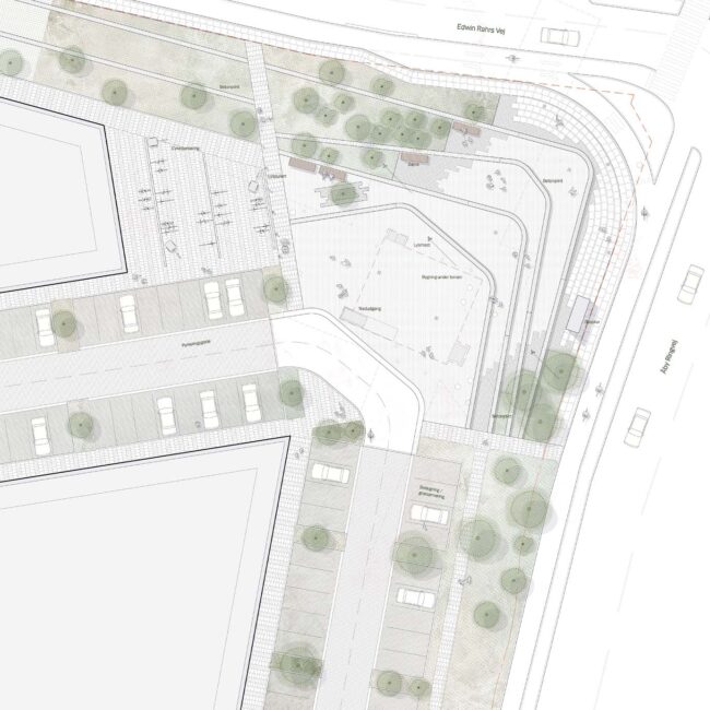 Omkring legeområdet belægges terræn i forbandt med brug af Bella fin flise, dette skaber et spil i den belagte overflade. På pladsen defineres fast inventar som lysmaster, der oplyser området. Der faciliteres også en overdækket cykelparkering.