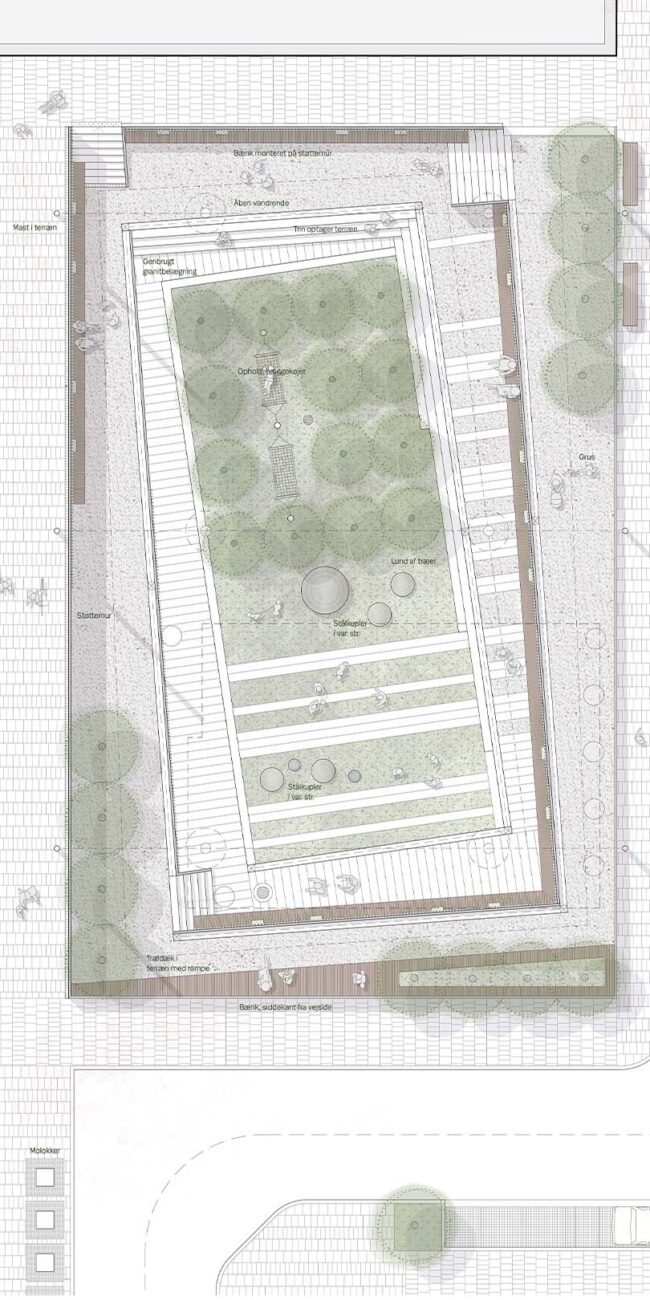 For at markere hjørnet ud mod Åby Ringvej og Edwin Rahrs Vej udformes pladsen med trapper i form af 3-5 forskudte flader, der terrasserer ud mod Åby Ringvej. Niveauerne opstår ud af områdets naturligt faldende terræn. De forskudte flader markeres af et bordurtrin/plint i skiftevis beton og granit. For at opnå en sammenhængende belægning belægges pladsen ligeså skiftevis med chaussésten og coloc. Ud mod Edwin Rahrs Vej etableres et grønt bed med træbeplantning. Dette sikrer, at der skabes en afstand mod biltrafikken. Der indbygges inventar og kurrateret belysning, som skal understøtte pladsens kvaliteter og funktion som mødested og ankomstområde til den nye bydel Helheden.
