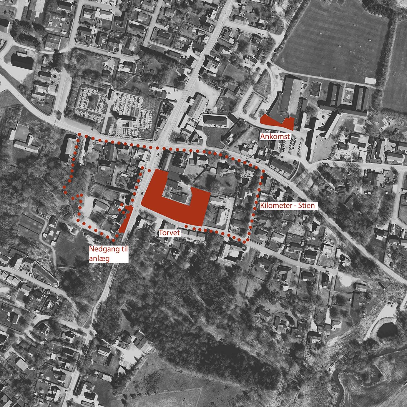 Tre nålestik/områder kædes sammen en af en fælles ny rute, ’Kilometerstien’, der som en ny rød tråd væver byen bedre sammen. Torvet, ankomstpladsen til Sport- og Kulturcentret og Adgang til Anlægget, er det tre særlige steder, der i dette projekt udvikles og renoveres. Her etableres der funktionelle møde- og opholdssteder, der opfordrer til uformel og naturlige møder for byens borgere og besøgende og samtidig løfter og forskønner nedslidte steder i bymidten.